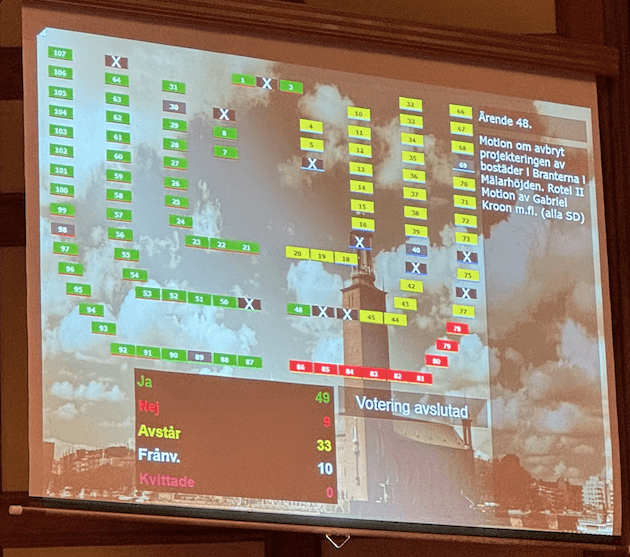 SD röstade emot och uttalade att byggnation ska passa in och reflektera områdens befintliga identitet, snarare än att förändra det till förmån för något annat. Utifrån denna utgångspunkt anser SD det finnas flera skäl till att stoppa bebyggelsen som föreslås i ärendet. Det har vidare framgått tydligt att det är många lokalboende och oroade medborgare som engagerat sig i frågan för att stoppa det som de anser vara en försämring av området. SD anser att nybyggnation inte ska påtvingas motvilliga medborgare. Lokal förankring och möjligheter att på demokratiskt vis kunna påverka sitt närområde bör uppvärderas vid överväganden som dessa.